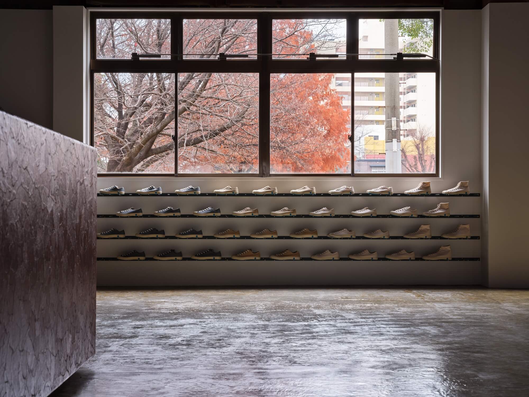 1873年の創業以来、久留米の自社工場で靴を生み出し続けるシューズメーカー、ムーンスターの本社直営店。