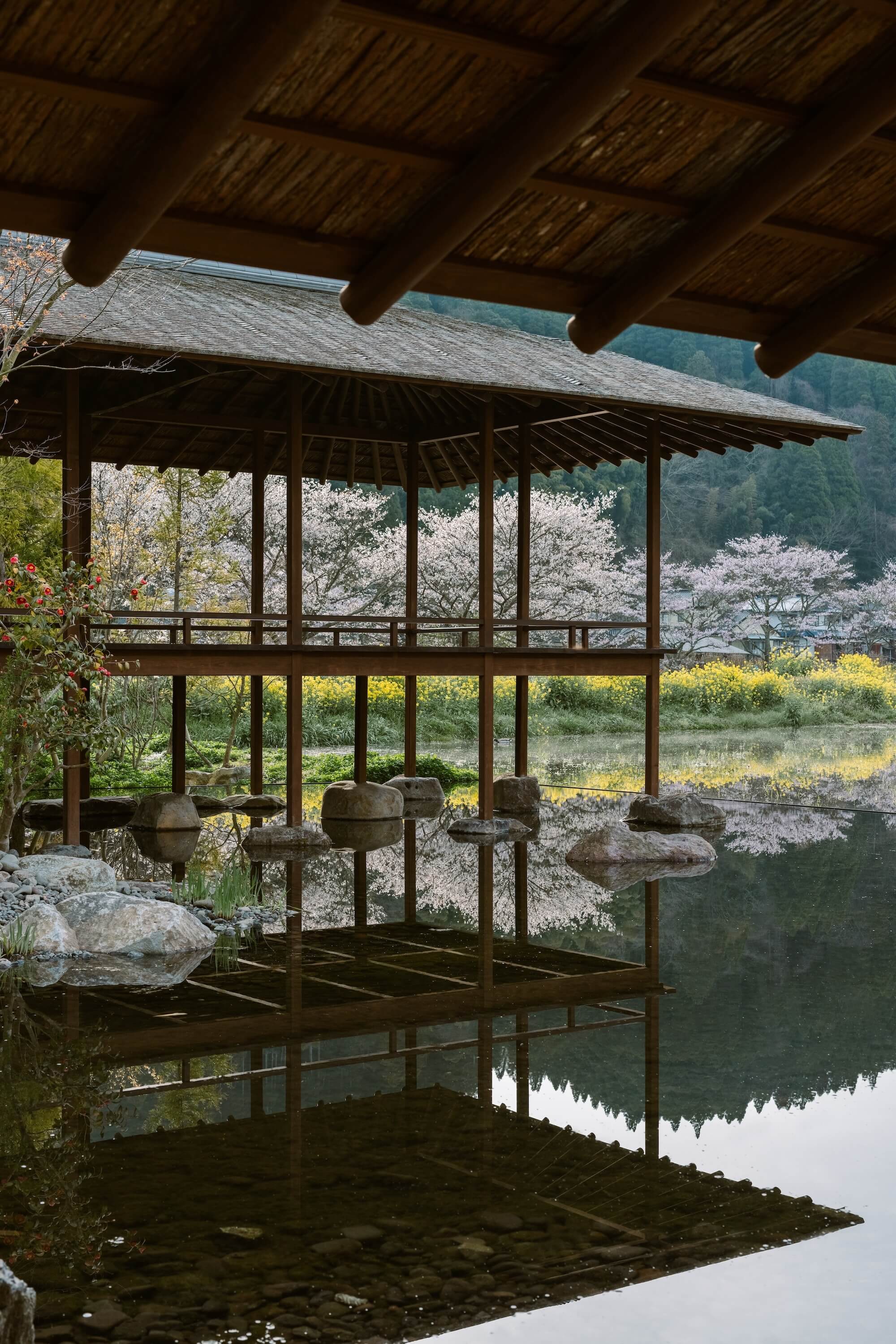 地元民と観光客が混在する建築空間になることを想い描き、地元民には気軽な寛ぎを、観光客にはこの地の本質的な体感を提供したく、”外の建築”を主軸に空間を構成することにした。私にとっての”外の建築”とは”屋根の建築”を意味し、つまりは建築の原点とも言えるだろう。如何に美しい木架構の屋根を架けるか、そんな建築の原点を日本の原風景が残るこの地で熟考できたことは貴重な経験となった。